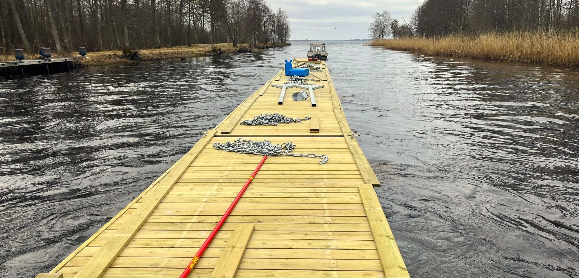 Den här bryggan är 35 meter lång, det är långgrunt på den här platsen. Längst ut en vinkel så att båtarna innanför skyddas lite. Bryggan ligger i Småland.