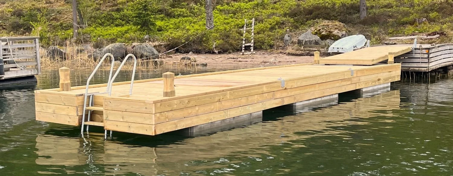 Den här bryggan har många extra detaljer. Den är lite stabilare, då flytblocken sitter tätare än vanligt. Den har träinklädnad, träpollare och infälld badstege på nocken. Det blev väldigt fint!
