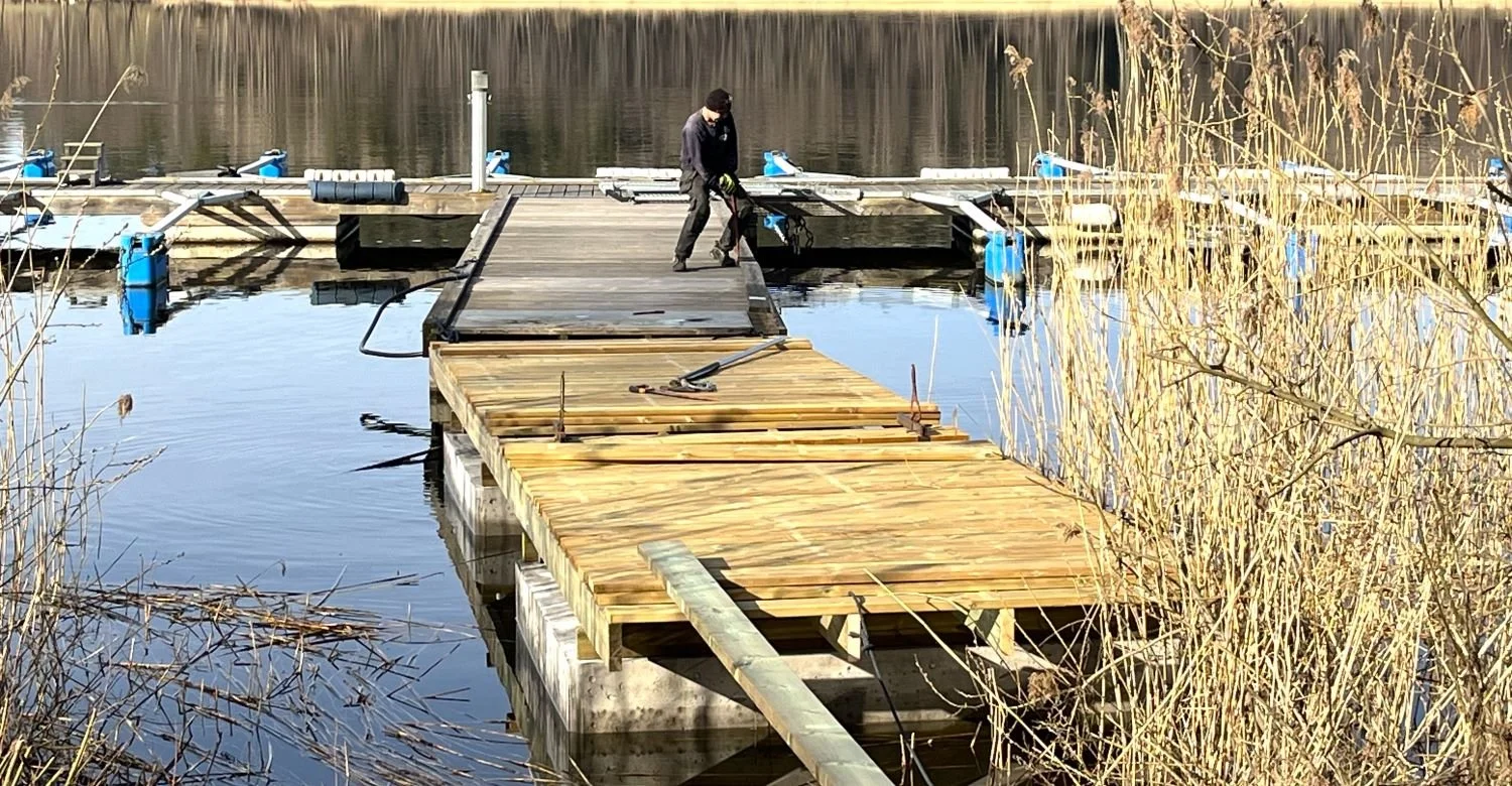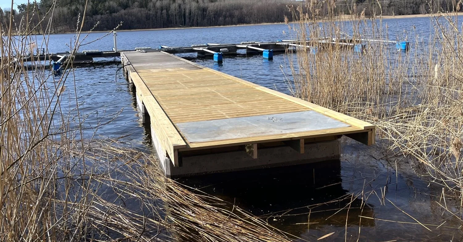 Här låg tidigare en separat brygga mot land. Båtklubben ville gärna ha en och samma brygga in till land, så då längde vi på gamla bryggan med 8 meter. Det går bra att skarva och bygga på en befintlig Timbobrygga. Det går att skarva andra bryggor också, men då får man göra lite speciallösningar.