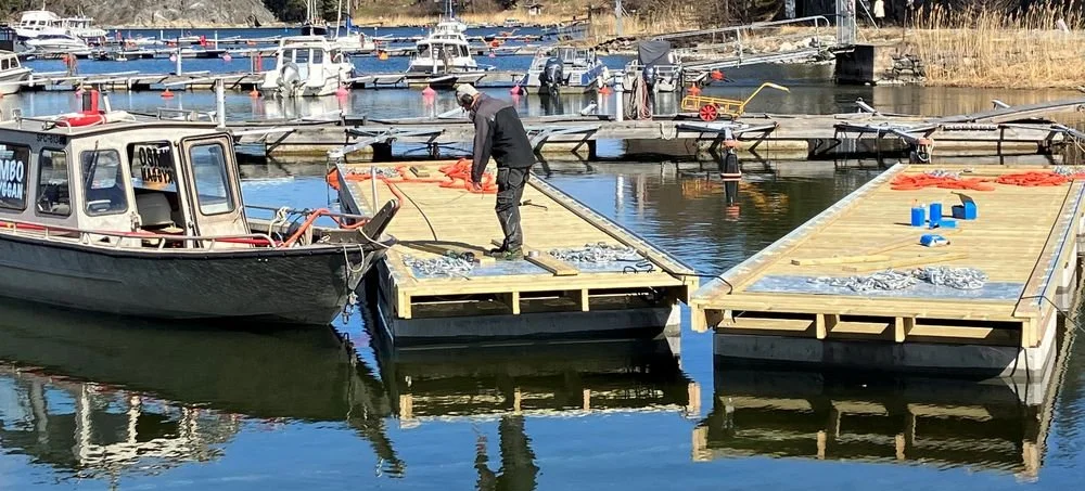 Två bryggor om vardera 12,5 meter ska förlänga befintliga bryggor på båtklubben. Här har vi byggt ihop dem och gjort allt klart för att förankra ut dem.