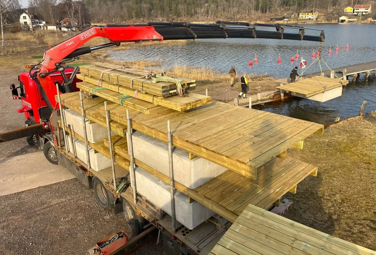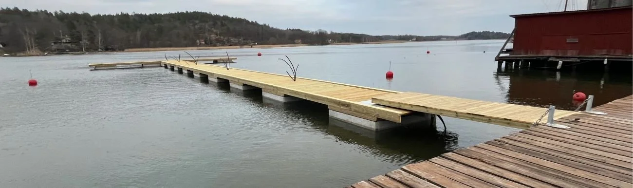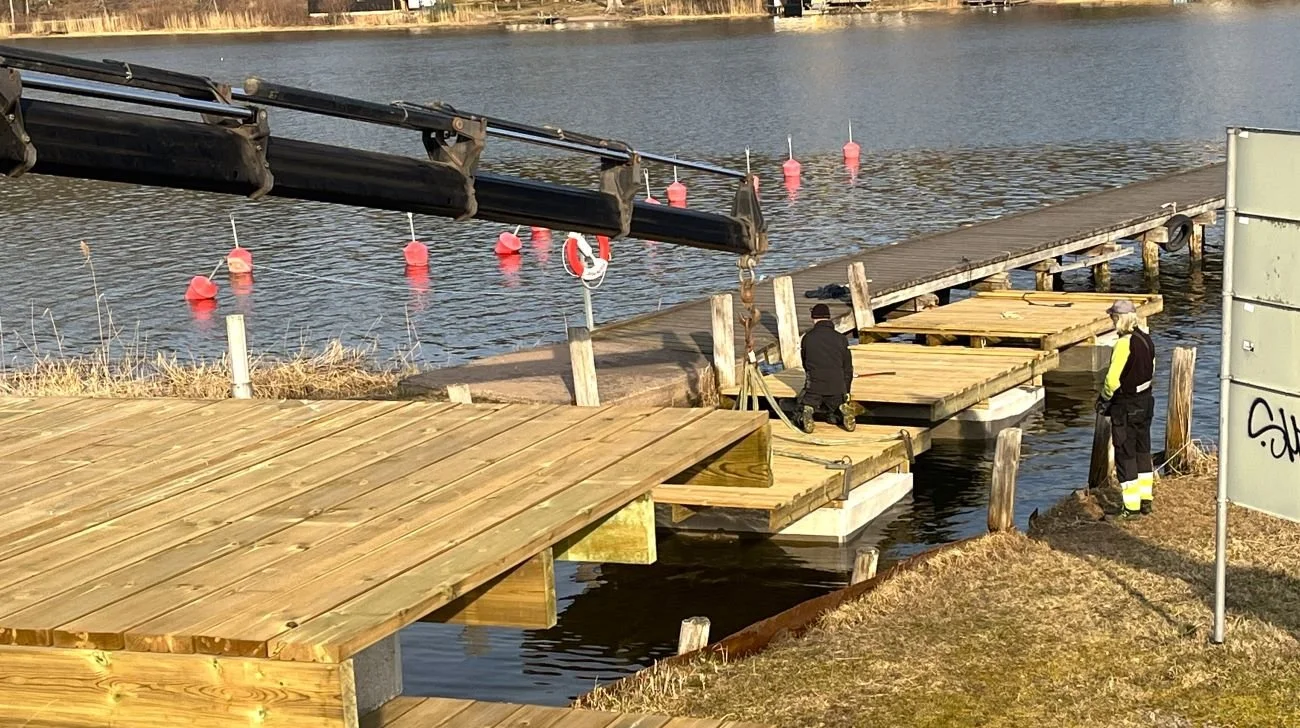 Här lade vi ut en ny gästhamnsbrygga i Gamleby, Västervik, i mars. Bryggan är 40 meter lång, och bryggan längst ut är 18 meter lång. Det som sticker upp ur bryggan är rör för el och vatten, där kommer det monteras stolpar för el och vatten.