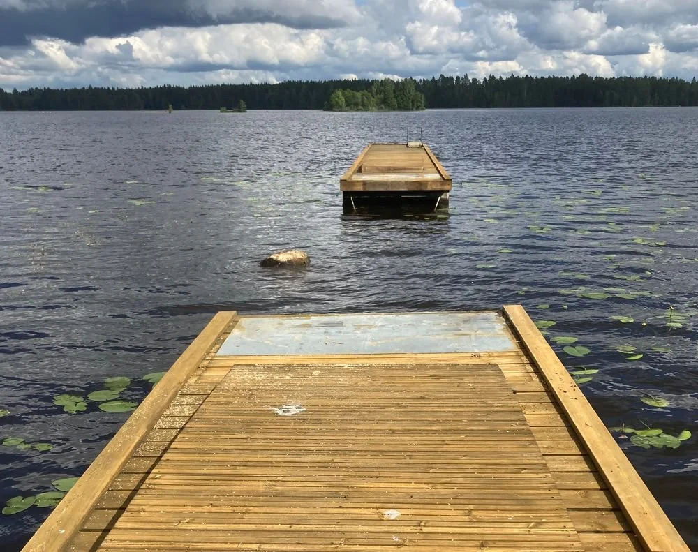 Så här såg det ut när vi hade gjort den första leveransen. Det är två bryggor, med en fast bryggdel i mitten. Det har med tiden visat sig att det är svårt att få den fasta konstruktionen att hålla så vi fick i uppgift att riva den fasta sektionen och bygga ihop de två flytbryggorna.
