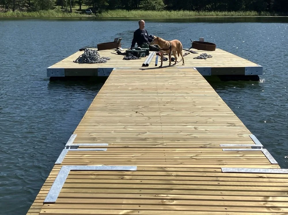 Så här blev slutresultatet. En rejäl brygganläggning för att kunna njuta av bad och sol, samt kunna ha en båt förtöjd.